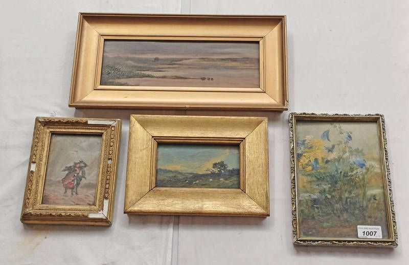 4 gilt framed oil paintings: figures in a storm; still life of flowers,,and 2 others, all unsigned