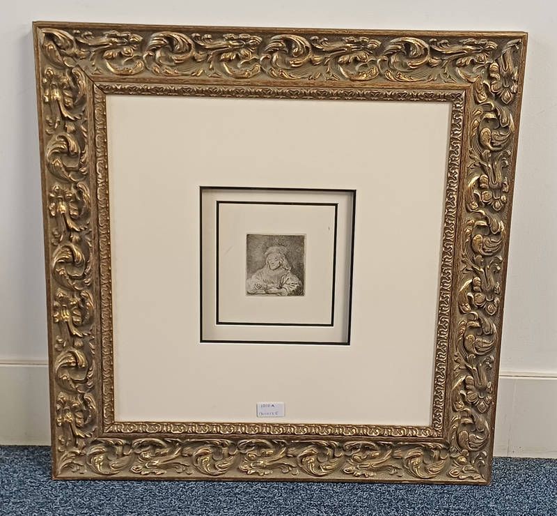 After rembrandt van brijn, the card player, signed and dated in the plate, gilt framed etching on ingres d'arches off-white laid paper, 20th century impression printed by majorie dan dyke from the millenium edition, limited to 2500 examples, 22cm x 21cm