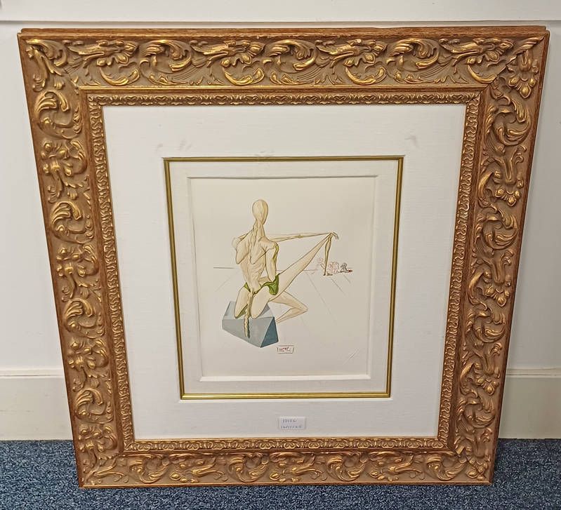 After salvador dali, ''minos-inferno 5'' signed in the block, with blind stamp of the editor j. estrade to bottom right, gilt framed colour wood engraving on rives paper, one of 100 images from ''the divine comedy'', published by les editions d'art les heures claires-paris. 36cm x 29cm