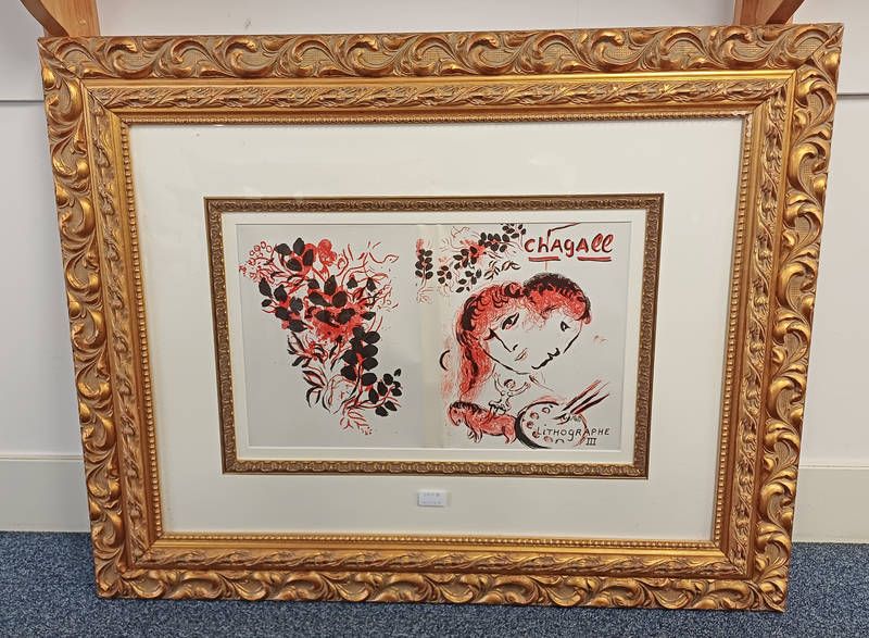 After marc chagall, cover-lithographe iii, gilt framed lithograph on woven paper, one of 2 from ''the lithographs of chagall-volume iii'' from the deluxe edition of 75, printed by mourlot-paris, published by andre sauvet. 34.5cm x 54.5cm