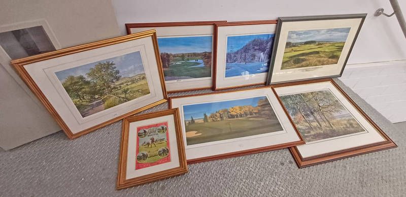2 framed mcintosh patrick prints of rural scenes, both signed in pencil, and various golf related prints, largest: 42cm x 80cm