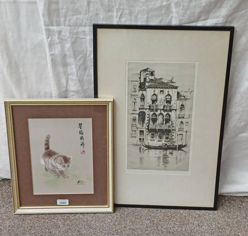 Albany e howarth, venice, signed in pencil, framed etching, 39cm x 21cm, and oriental needlework of a cat, with character marks