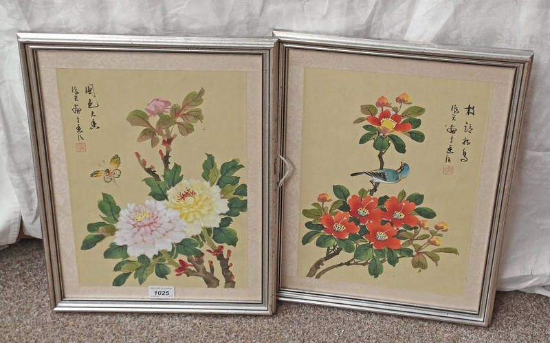 2 framed oriental watercolours depicting flowers, birds and butterflies, both with character marks, 35cm x 25cm each
