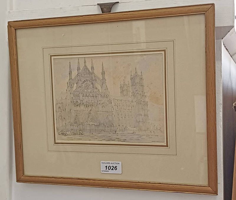 William frome smallwood westminster abbey signed, label to reverse framed ink and wash sketch 15cm x 20cm
