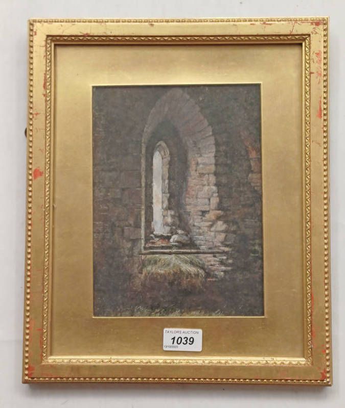 19th century scottish school watercolour of a church/cathedral window, unsigned, 17cm x 10cm