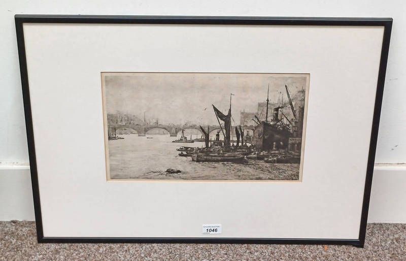 Hp evans london bridge label to reverse, unsigned framed etching 22cm x 37cm