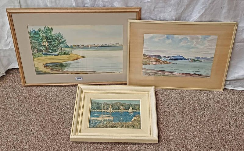 Jk maxton, scottish loch scene, signed watercolour, graham du chair, findhorn bay, signed, label to reverse, watercolour, and an unsigned oil on canvas of sailing boats. largest: 31cm x 48cm
