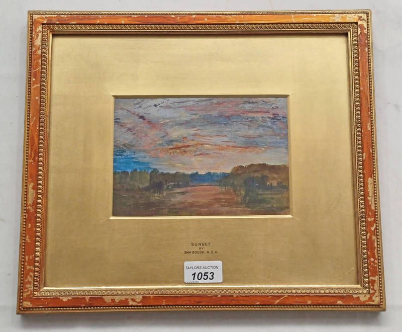 19th century scottish school, ''sunset'', unsigned, marked to mount ''sam bough'' gilt framed watercolour, 12cm x 18cm