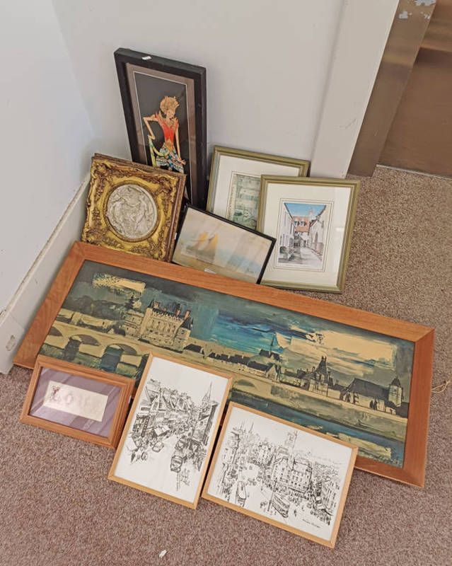Chas heldridge, sunrise venice, framed pastel, gilt framed resin plaque depicting nude figures, etc