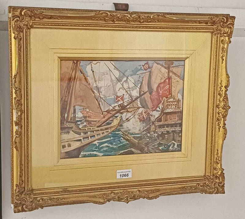 John milne purvis galleons at war signed and dated 1908 gilt framed watercolour 23cm x 30cm