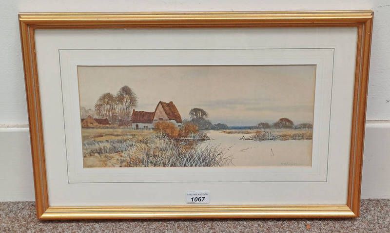 Francis gordon fraser river scene with thatched barn signed framed watercolour 17cm x 36cm