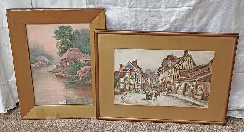 Oriental watercolour of a river village, signed s. itou, 49cm x 32cm and one other picture of a street scene