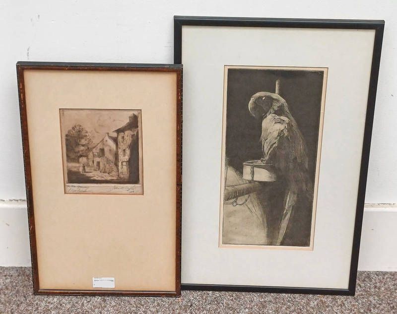 John a myles, the old grainary - montrose, signed in pencil, framed etching, 15.5cm x 13 cm, & framed etching of a parrot on a perch, unsigned, 34 x 16 cm