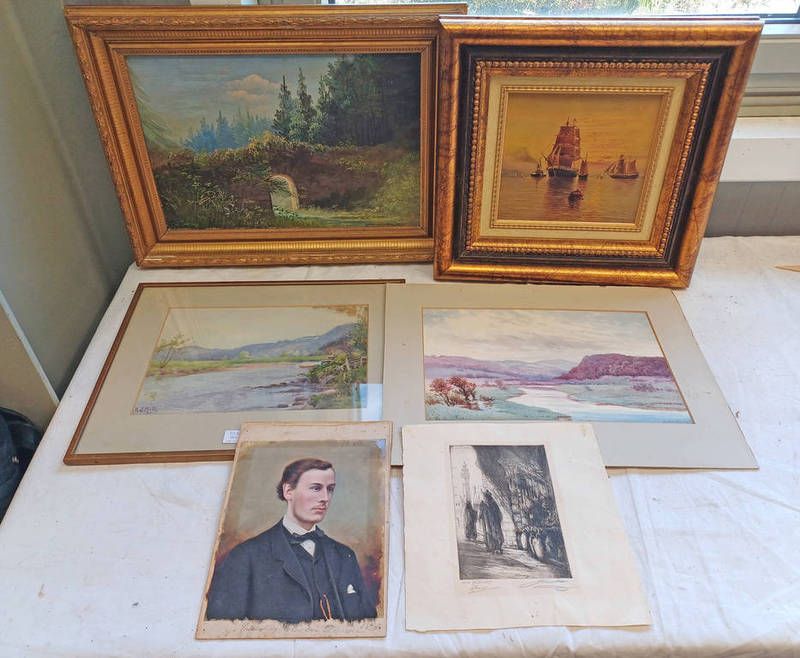 Gilt framed watercolour of a river scene, monogramed r.j.m.b., unframed portrait of a gentleman, dated 1890, signed indistinctly etc.