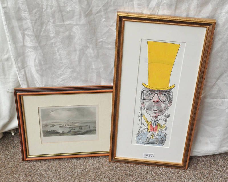 John springs, framed caricature of john major, watercolour and ink, signed, and a framed engraving of aberdeen harbour