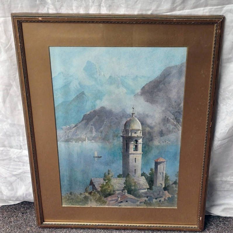 Colonel hrb donne at cremia - lake como signed, label to reverse gilt framed watercolour 58 x 40 cm