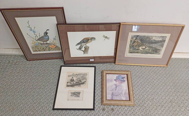 2 framed prints of birds of prey by m. morgan warren, both signed in pencil, 2 fishing related pictures, and 1 other. largest; 27cm x 41cm