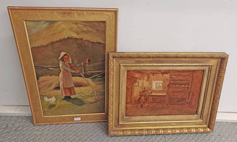 A morrison, morning paper, signed, gilt framed oil on canvas, 29cm x 44cm and a gilt framed oil on board of a girl and farm animals, monogrammed c.y.g and dated 1885, 58cm x 37cm