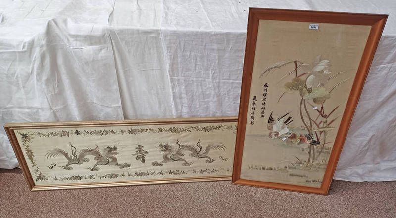2 framed oriental needleworks depicting dragons & birds, 1 with various character marks, largest 39 x 124 cm