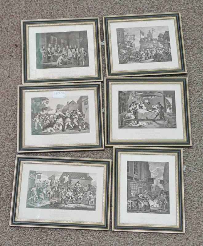 Set of 6 framed bookplate engravings of w hogarth scenes, 12 x 17 cm