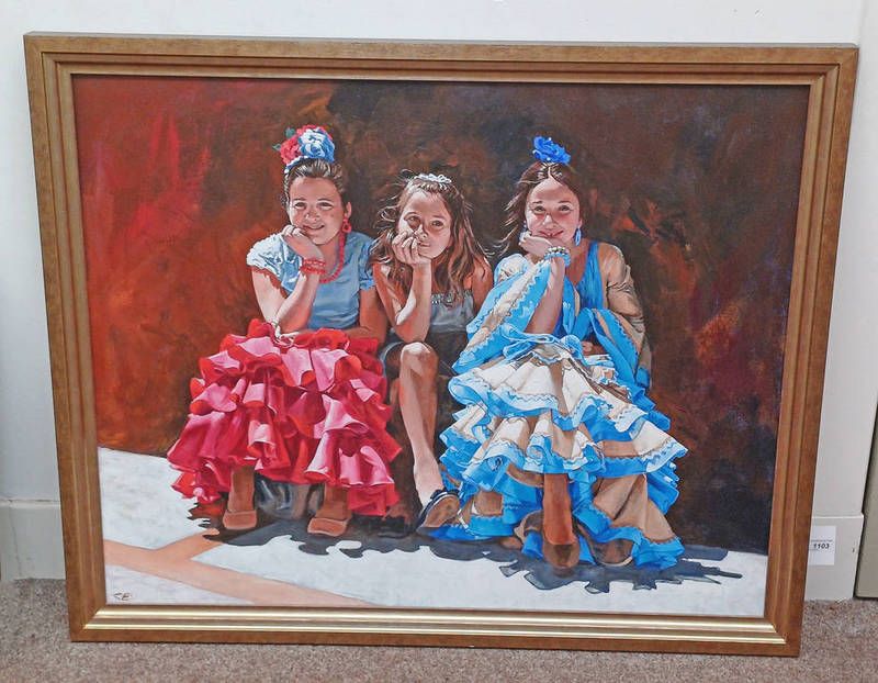 Christine ellingham 'tres muchaches' monogrammed c.e, label to reverse framed oil on canvas 80 x 99 cm