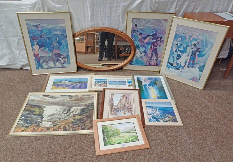 Ducal mirror, middle eastern style prints, framed watercolour by pam balfour of glen prosen, etc, largest 52 x 73 cm