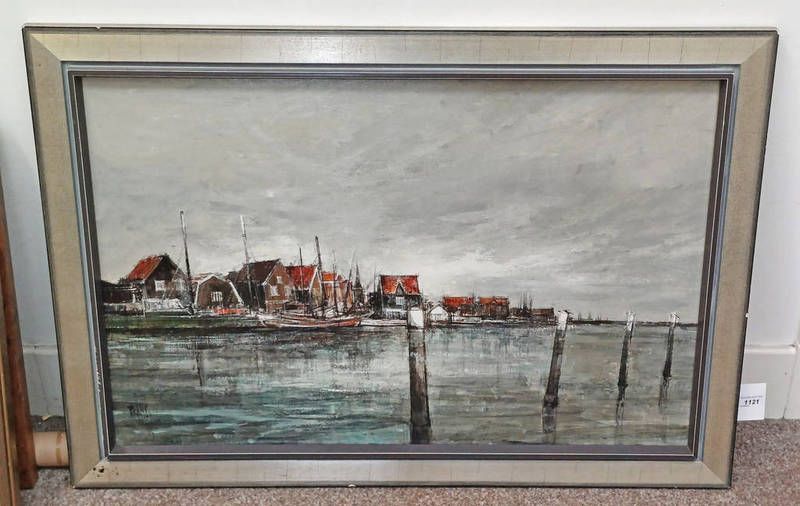 Francois franc (b. 1926) harbour scene oil on canvas signed also inscribed 'vlisingen, holland' on the reverse 59cm x 89cm