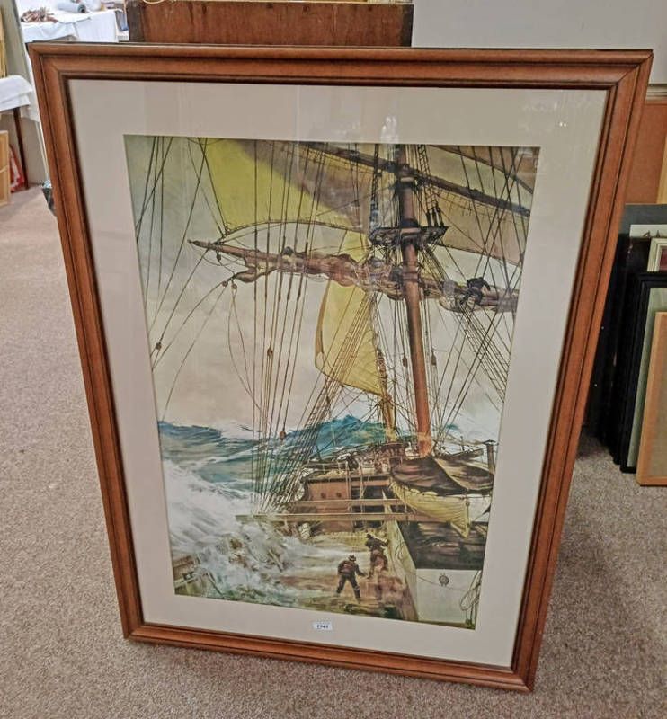 Large framed print after montague dawson depicting a boat in a storm, unsigned, 90cm x 60cm