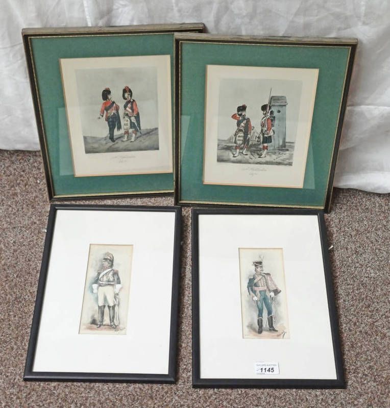 2 framed watercolours of military personnel, signed h. pearson applin, and 2 framed engravings after o. norrie of 42nd highlanders