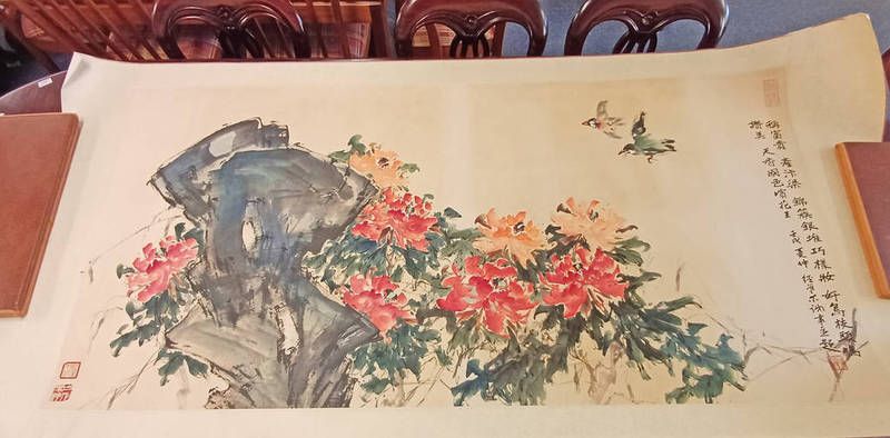 Unframed chinese scroll watercolour of red flowers bearing signature