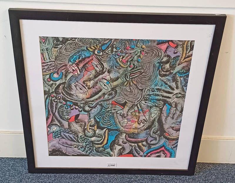 Xu demin abstract birds & figures signed framed watercolour 50.5cm x 49.5cm
