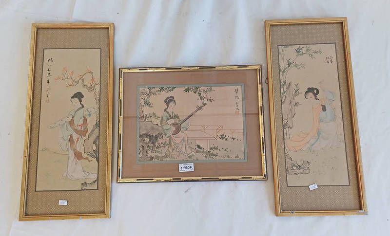 3 framed chinese watercolours of lady in a garden