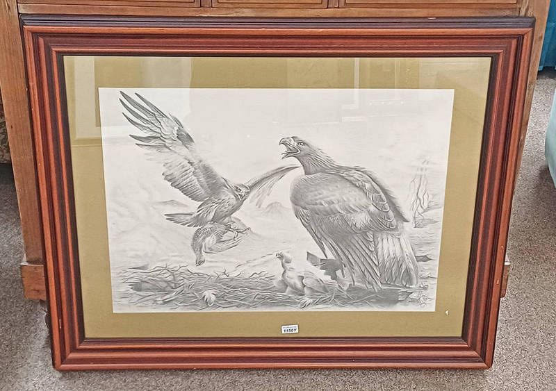 J w taylor pair of golden eagles & chick signed framed pencil drawing 54 x 74 cm