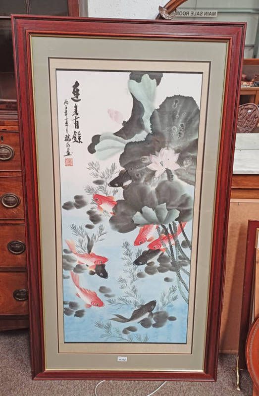 Framed chinese watercolour of koi carp with signature, 103 x 49 cm