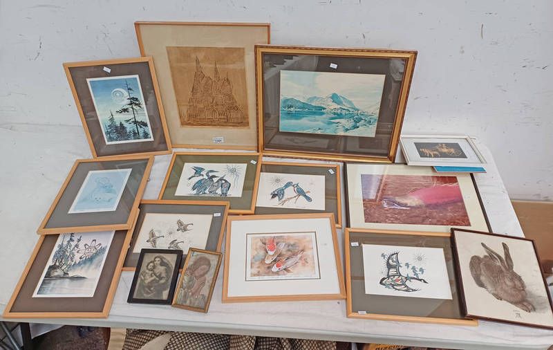 Framed etching of a temple/church scene, signed indistinctly in pencil, and various other pictures