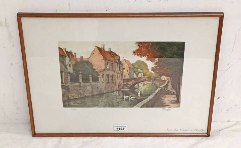 Framed etching of a french canal scene with swans, signed in pencil indistinctly 35cm x 32cm