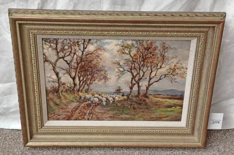 Gilt framed oil on canvas depicting a shepherd and his flock of sheep, signed indistinctly, 29cm x 45cm