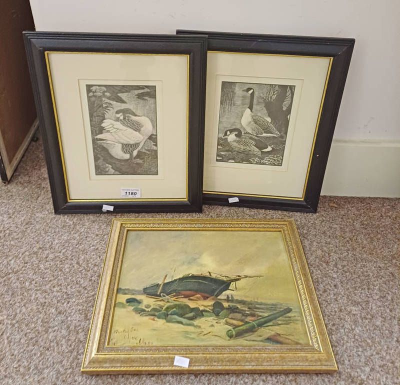 Gilt framed oil on canvas of a wrecked ship, signed indistinctly, and 2 framed lithographs of birds