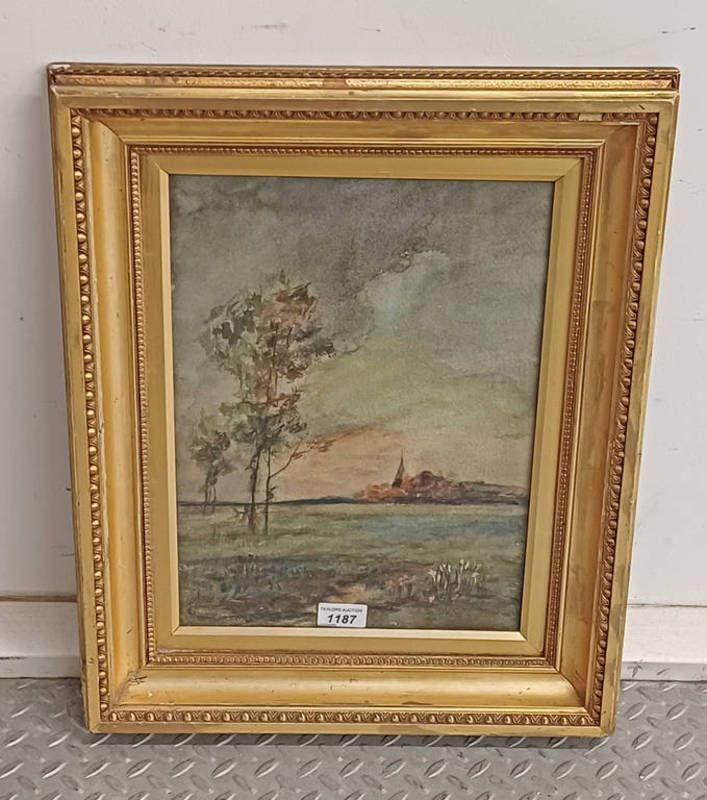 19th century gilt framed watercolour of a rural scene with monument on the horizon, unsigned, 37cm x 27cm