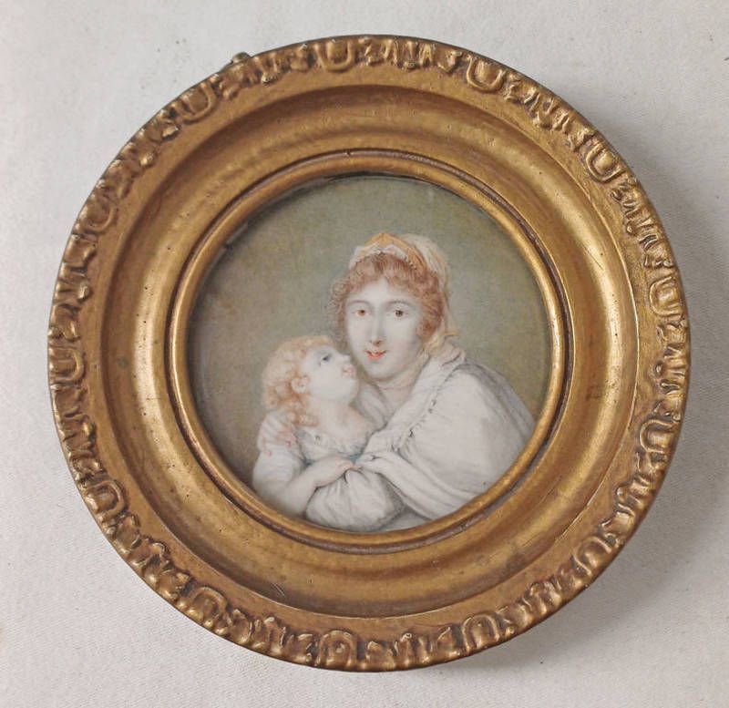 Gilt framed portrait miniature of woman & child - 8.5 cm diameter excluding frame