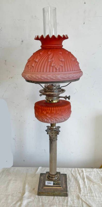Late 19th or early 20th century silver plated paraffin table lamp with pink & white shade & reservoir, 84cm tall