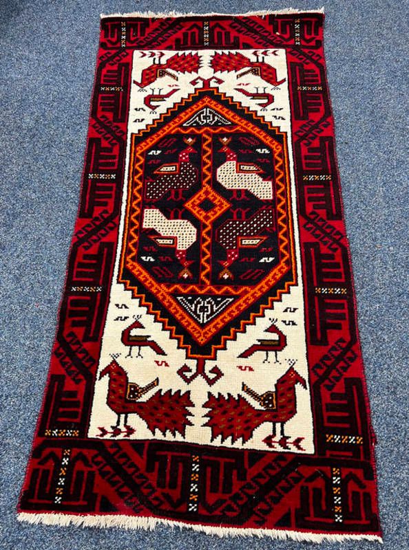 Red middle eastern rug with central lozenge design, 185 x 85cm