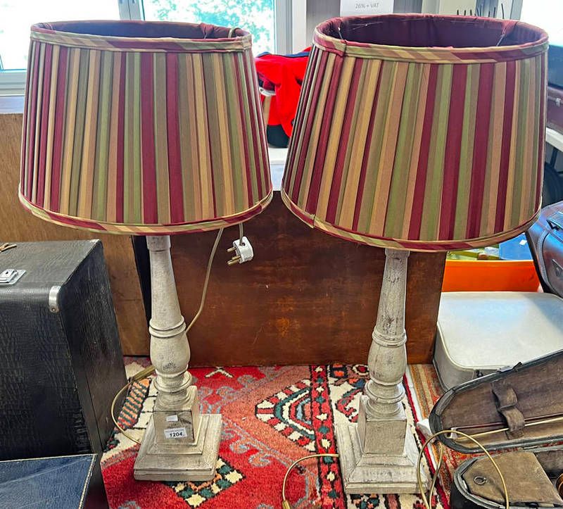 Pair of rustic carved wooden table lamps with striped shades, 73cm tall