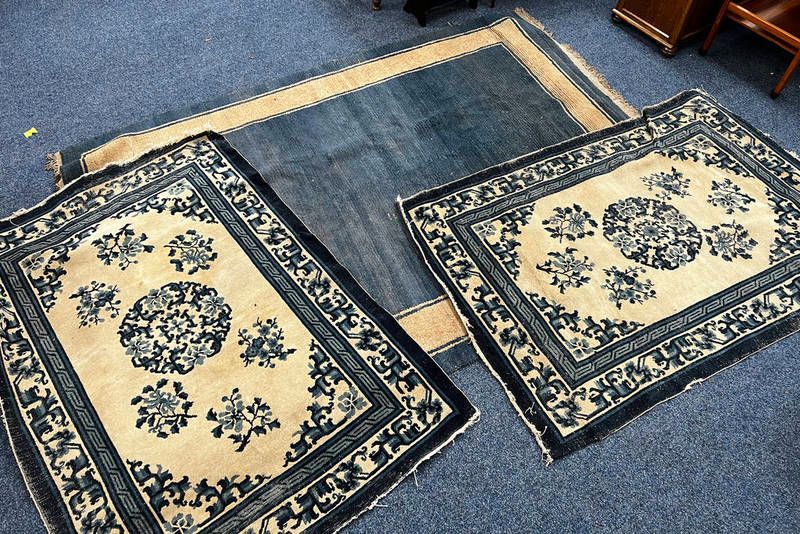 Pair of blue oriental floral decorated rugs, 185 x 125cm and a blue and beige carpet 184 x 260cm