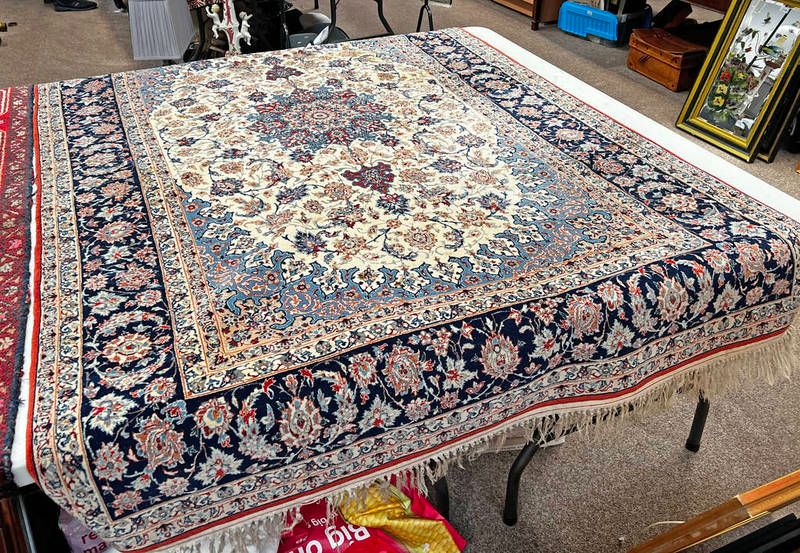 Multicoloured ground persian tabriz carpet with unique blue border, 290 x 180cm