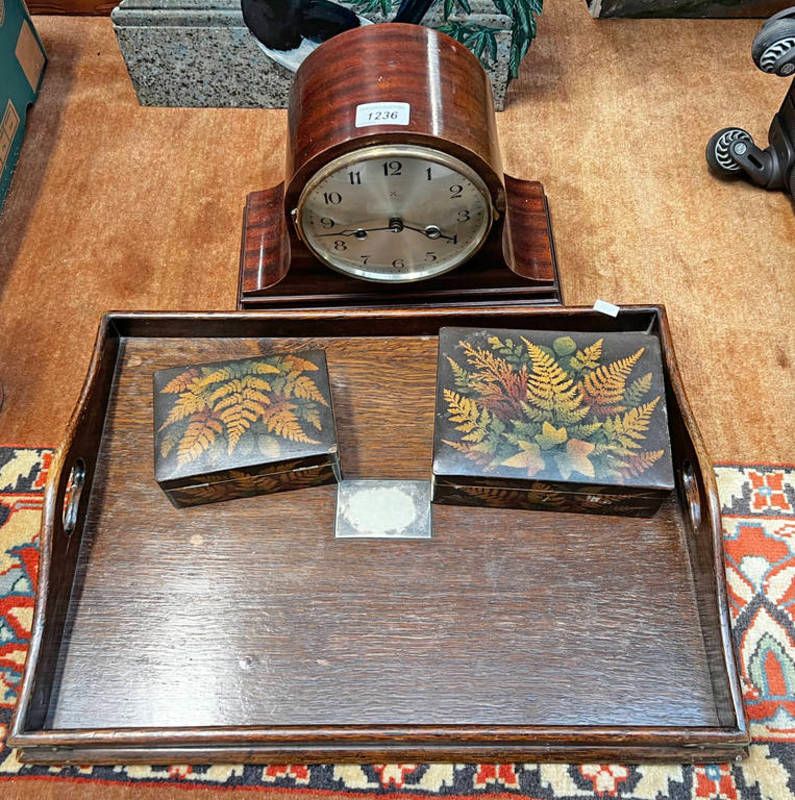 Mantle clock with silvered dial, oak serving tray & 2 fernware boxes