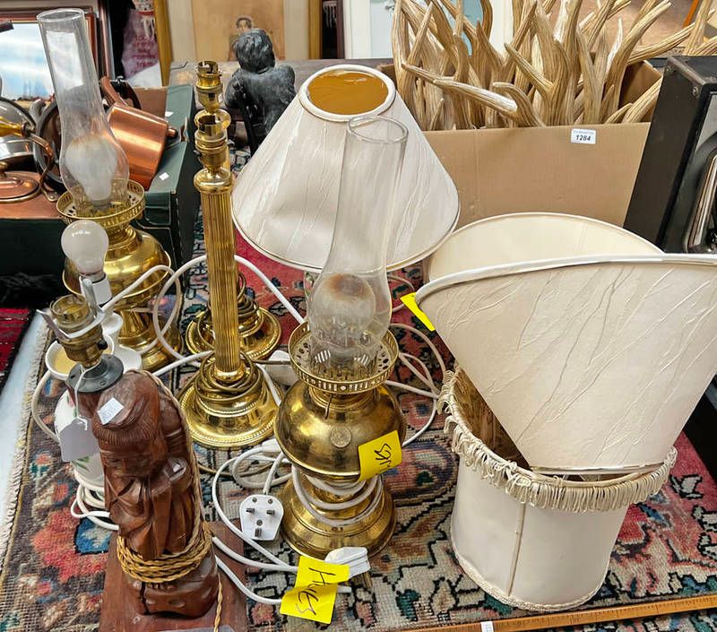 Selection of table lamps to include a carved oriental example, paraffin lamp etc