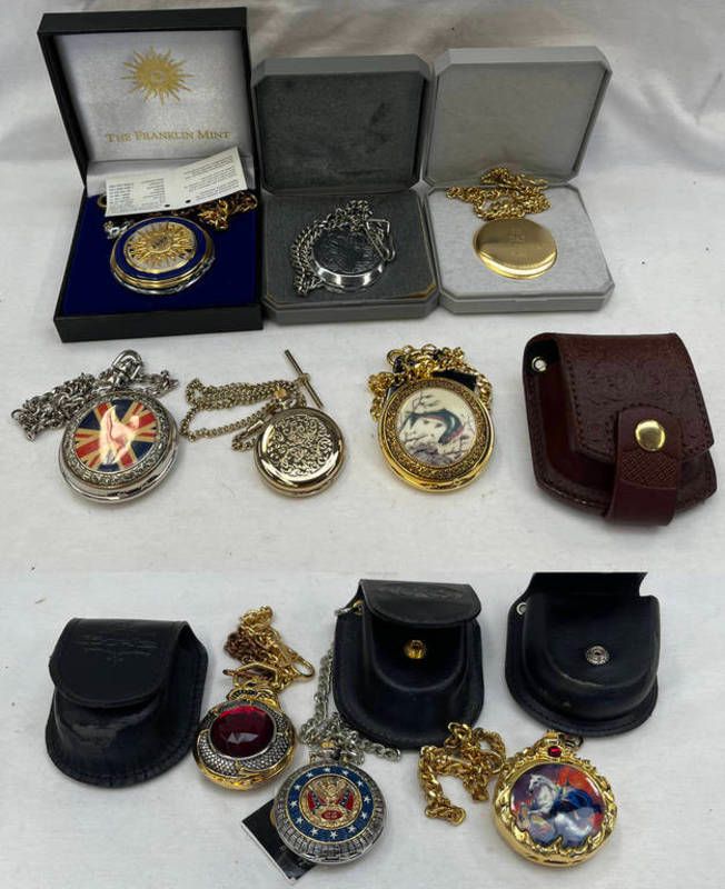 The collections choice in precision pocket watches, the franklin mint 2000 with chain in fitted case, the precision pocket watch, the franklin mint national & fish foundation pocket watch with chain & leather case, sekonda pocket watch with small dial & with chain & box, gilt cased pocket watch with quartz movement & chain pocket watch with the full royal coat of arms of the united kingdom & chain sekonda smaller size pocket watch with chain and boris hunter pocket watch with decorated case & naked lady decorated dial & fish & dragon decorative outer case marked knightstone collections with chain in leather case, the collections choice pocket watch the civil war library & museum robert e lee & chain & leather case, franklin mint lord of the rings gandalf pocket watch with chain & leather case