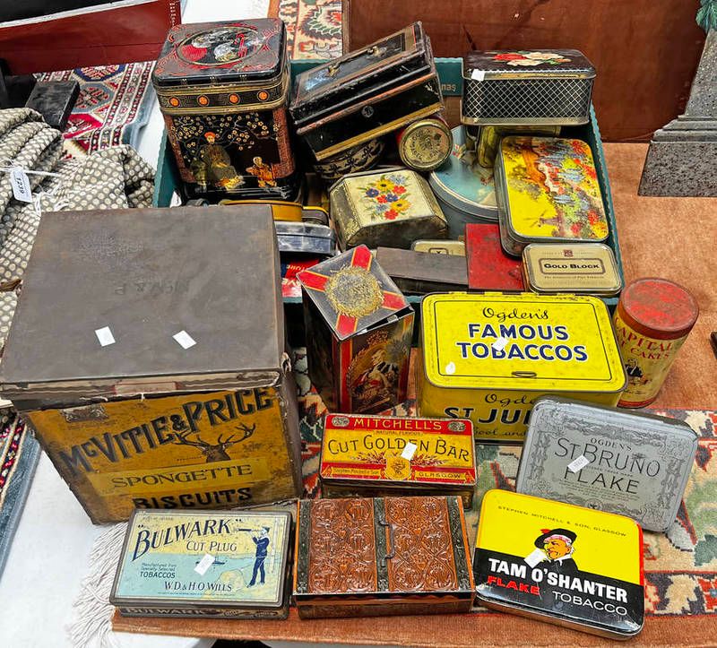 Selection of vintage tins to include capital oat cakes, ogdens, mitchells cut golden bar, etc in 1 box