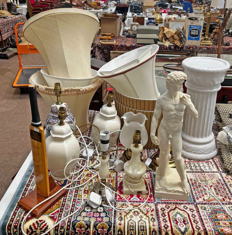 Selection of table lamps to include porcelain examples, pot stand, composite figure, miniature cricket bat etc